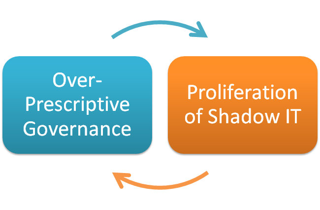 Let’s face it, to most people in IT, “Governance” is a dirty word. That perception is not born out of an idea that IT governance is bad, but out of the reality that IT governance is badly implemented in most organizations. When an organization confuses good IT governance with overly detailed and prescriptive IT governance, it starts to constrain rather than enable its people. And when people feel constrained and not empowered to make the decisions, they work around or against the process, which then results in proliferation of shadow IT.